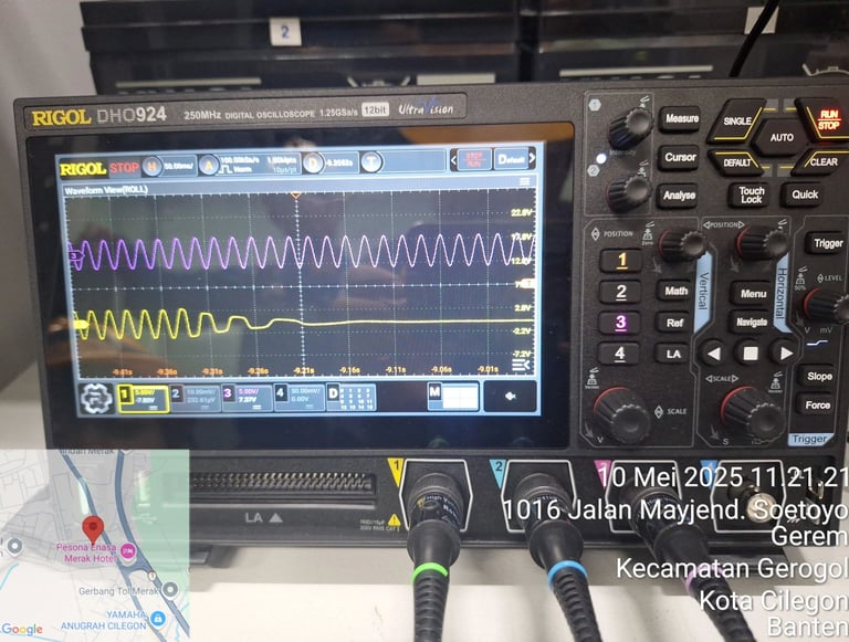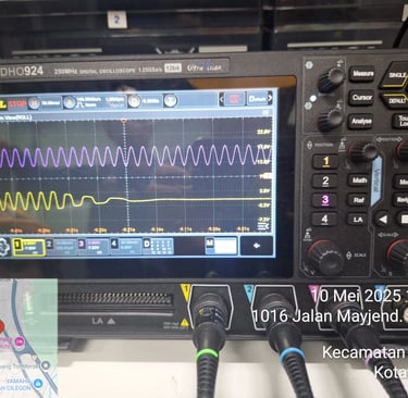 Sebagai verifikasi lanjutan, dilakukan pengukuran karakteristik switching inverter dan bypass menggunakan digital osiloskop Rigol DHO924. Pada mode inverter, teknisi menganalisis waveform sinusoidal untuk mengukur tingkat THD, kualitas switching PWM, kestabilan amplitudo, serta noise switching pada high-frequency band.