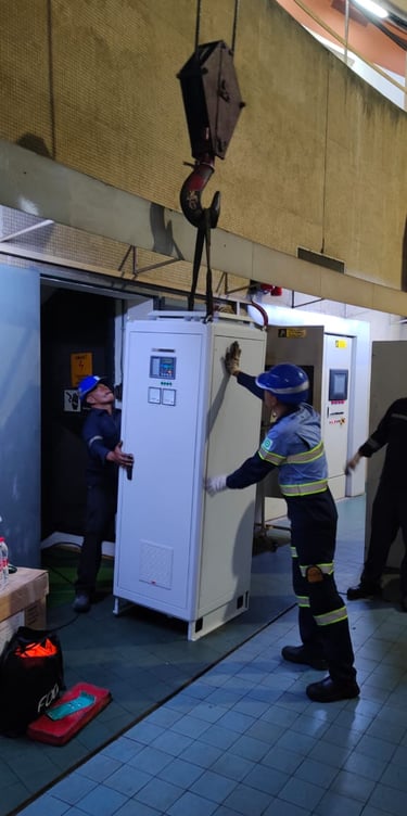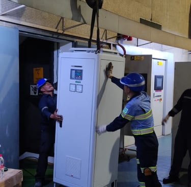 Proses instalasi rectifier dimulai dengan uncrating dan handling peralatan menggunakan lifting system, memastikan perpindahan kabinet dilakukan tanpa memberikan tekanan berlebih pada chassis maupun komponen internal. Unit rectifier diposisikan mengikuti koordinat layout dengan memperhatikan jarak aman terhadap panel lain, clearance pendinginan, dan ruang servis. Penempatan yang presisi sangat penting untuk memastikan aksesibilitas saat operasi maupun maintenance.