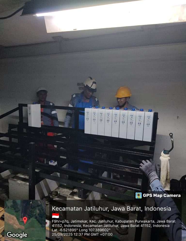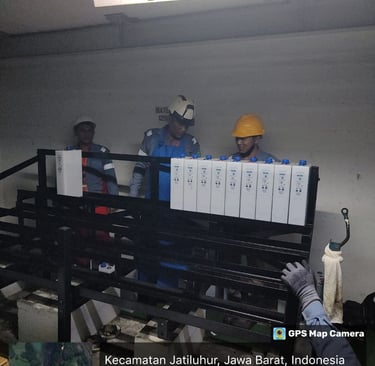 Pada pekerjaan instalasi baterai, teknisi melakukan pemasangan dua bank Battery Alcad Ni-Cd dengan metode pengaturan cell sesuai konfigurasi seri untuk mencapai tegangan sistem 125 VDC nominal. Setiap cell diuji nilai tegangan, visual check terhadap elektrolit, kondisi terminal, serta pemeriksaan torsi pada sambungan inter-cell link. Rangkaian baterai dipasang pada rack yang telah di-grounding untuk memastikan keamanan sistem.